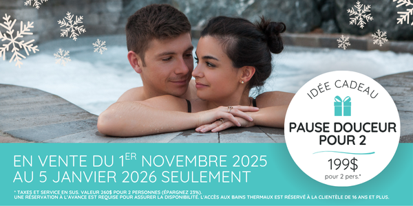 - L'accès aux bains thermaux à partir de 16h00 le jour de l'arrivée jusqu'à 11h00 le jour du départ est inclus dans la plupart de nos forfaits (supplément 25$ par personne pour un accès hâtif dès 13h00 le jour de l'arrivée ou pour un accès prolongé après 11h00 le jour du départ).